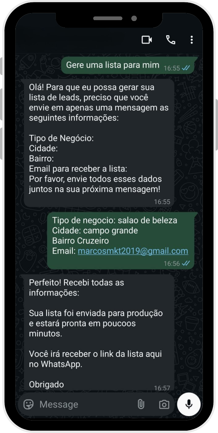 Passo 3: Você envia seu pedido por mensagem (ex: “lista de 50 clínicas de estética no Porto”).